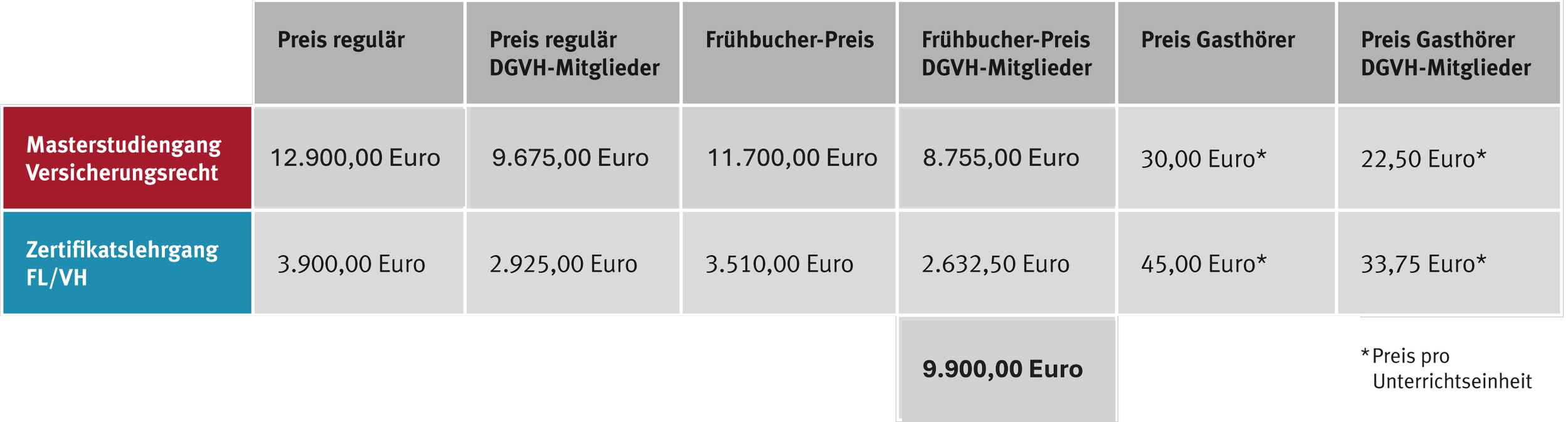 Erfreulicherweise bietet JurGrad für alle DGVH-Mitglieder und alle von Fördermitgliedern des DGVH entsandten Teilnehmer einen Rabatt von 25% auf den angebotenen Masterstudiengang Versicherungsrecht, den Zertifikatslehrgang FINANCIAL LINES/VH sowie die Gasthörerschaft an. Dabei können sich die Rabatte auch kumulieren. Melden Firmen mehr als einen Teilnehmer an, so erhalten diese weitere 10% Nachlass.